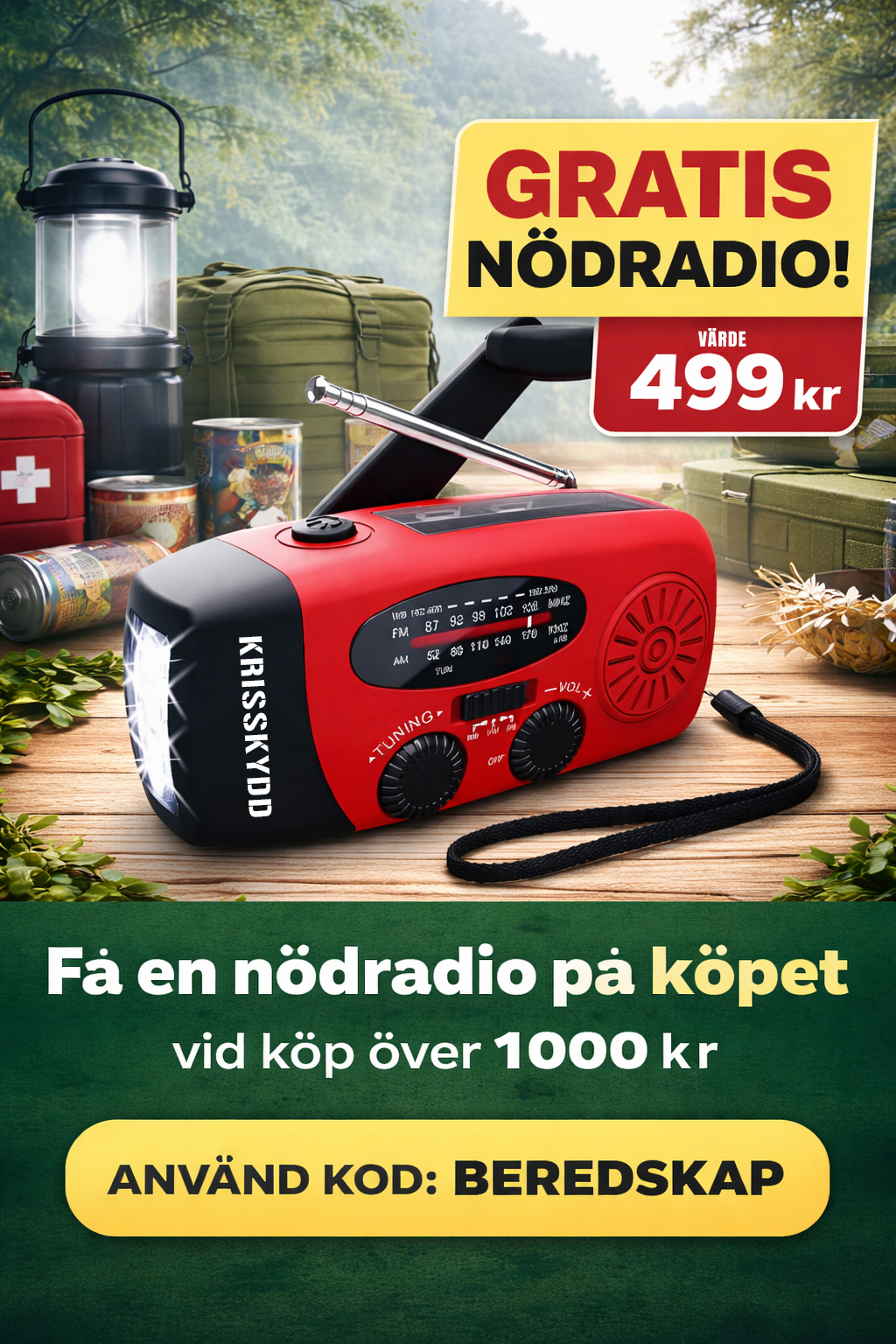 Handla för minst 1000 kr, använd koden BEREDSKAP och få en nödradio (värde 499 kr) utan kostnad under kampanjperioden.