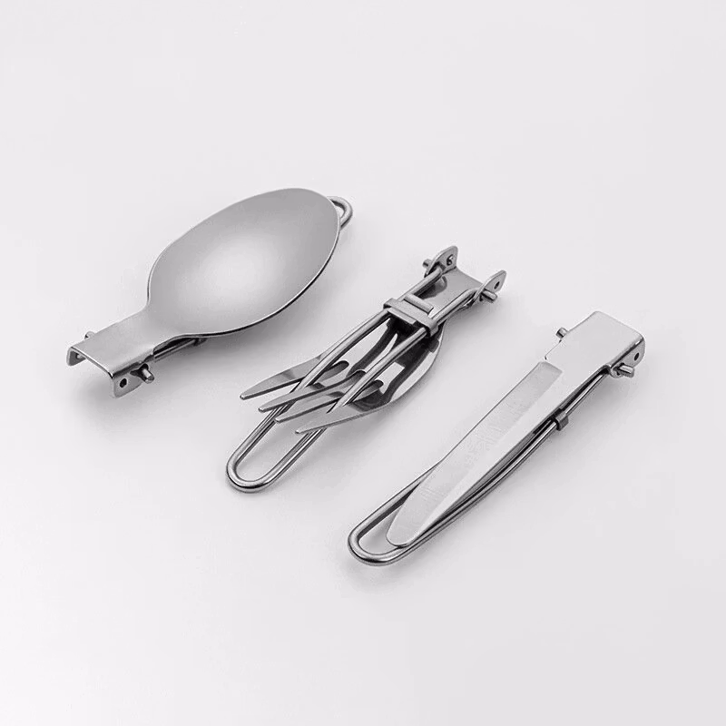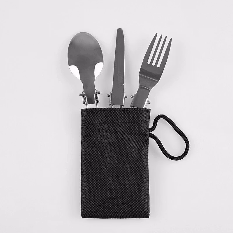 Campingbestick i rostfritt stål i 3 delar i RPET-påse. Den perfekta presenten till den friluftsälskare som regelbundet gillar att campa.