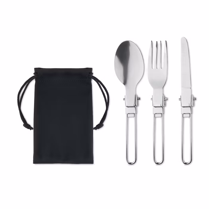 Kniven, gaffeln och skeden kan vikas på mitten för att ta upp så lite utrymme som möjligt. så att du kan ta med dig dem. Påsen för besticken är tillverkad av återvunnen PET-plast.