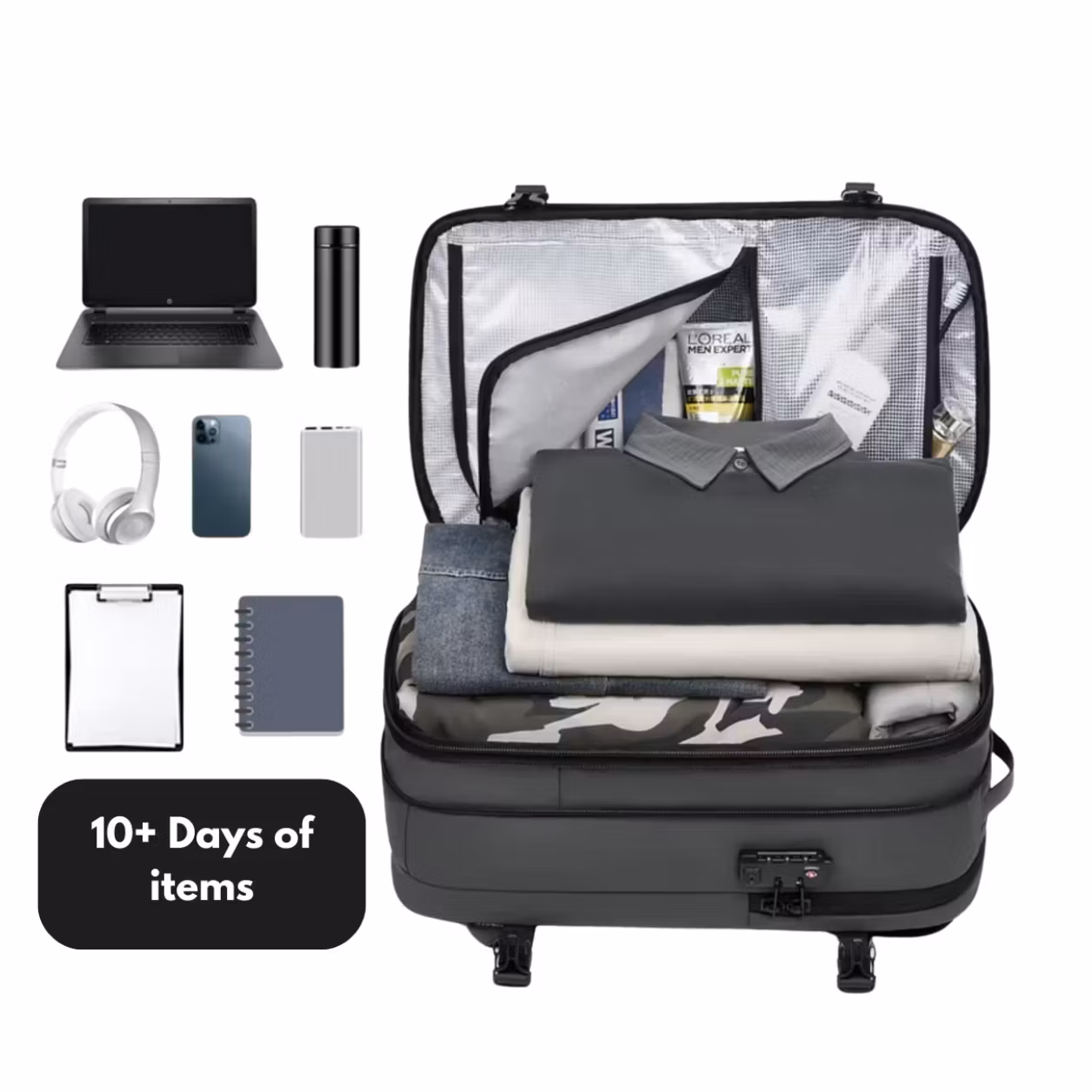 Den är skapad för att rymma mer än du tror, hålla ordning på dina saker och hjälpa dig undvika onödiga avgifter för extra bagage. Perfekt för dig som vill resa med stil, funktion och hållbarhet i fokus.