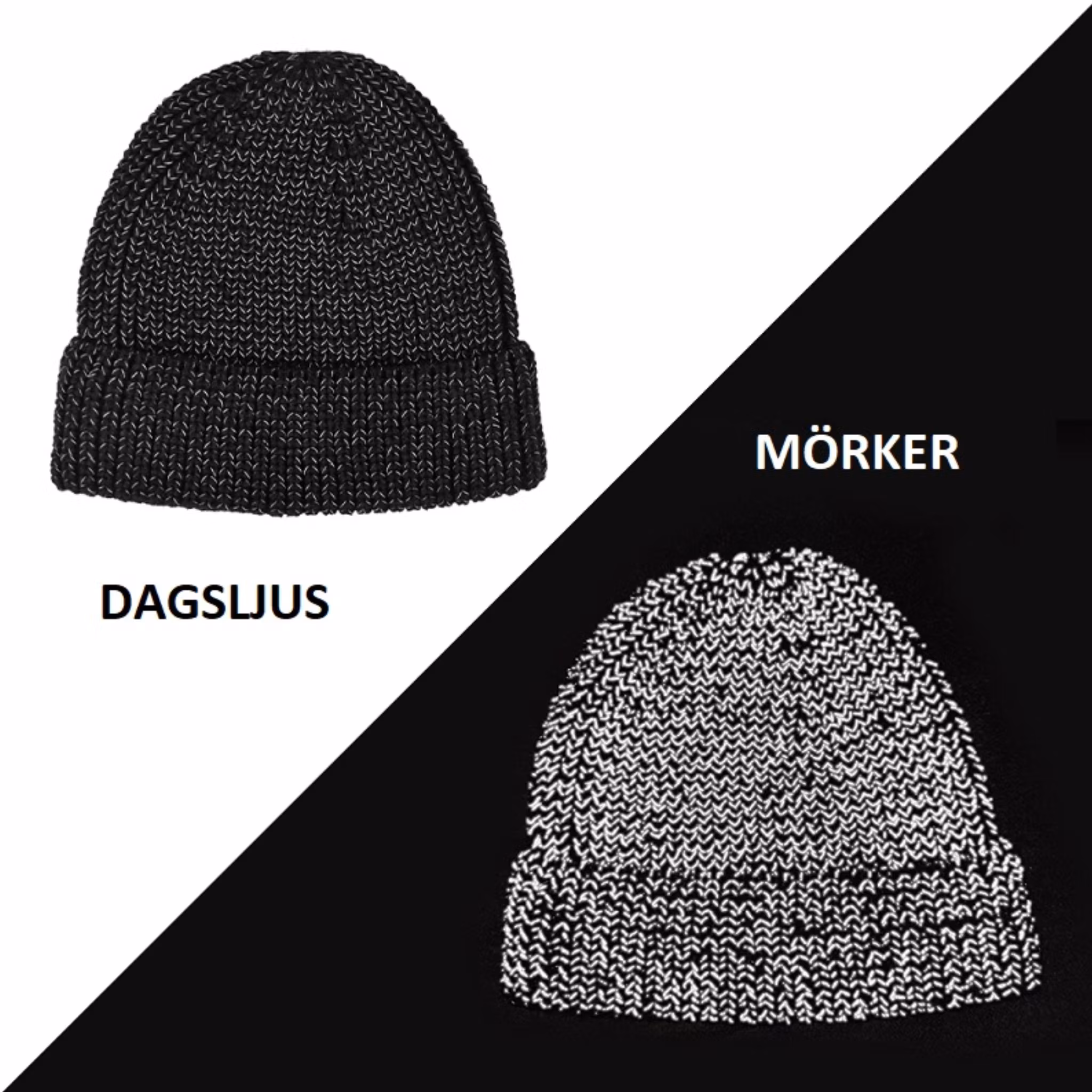 Mössan är mjukt stickad i hög kvalitet med lite stretch, enkel att ta på och skön att bära under kyliga dagar. I dagsljus ser den ut som en vanlig stickad mössa, men i mörker reflekterar trådarna ljuset och gör att du blir mer synlig.